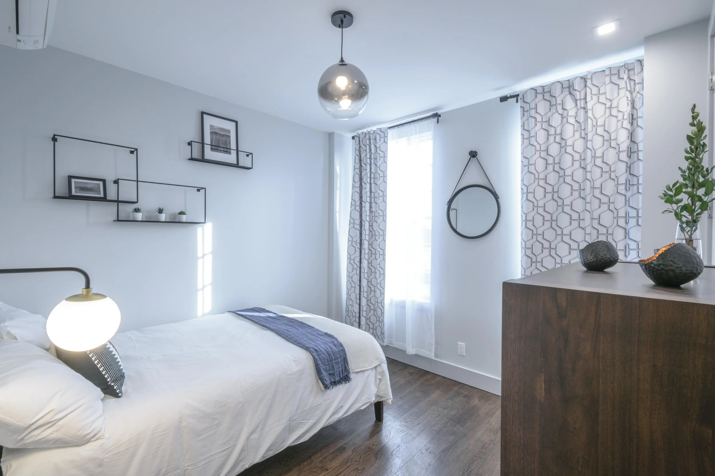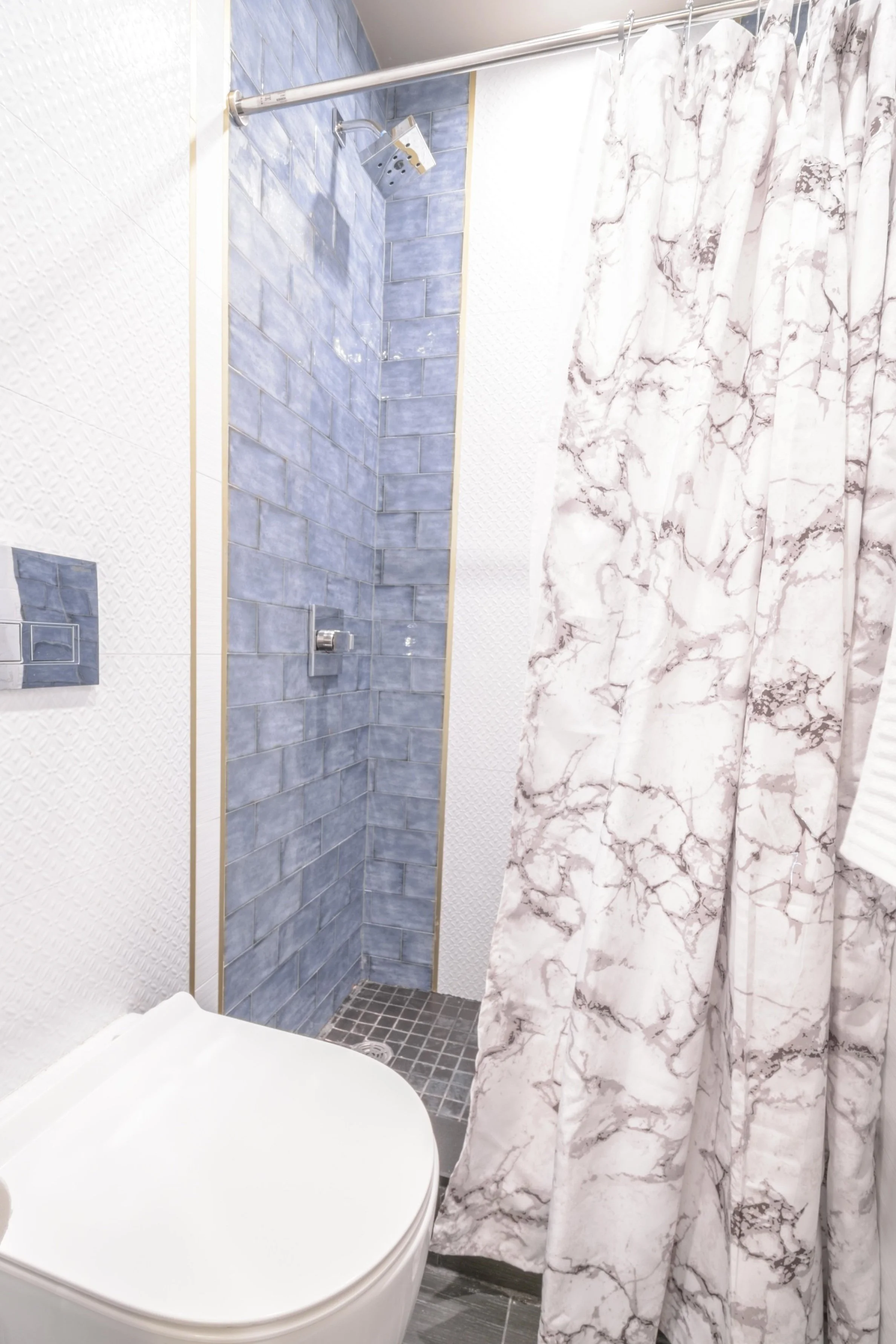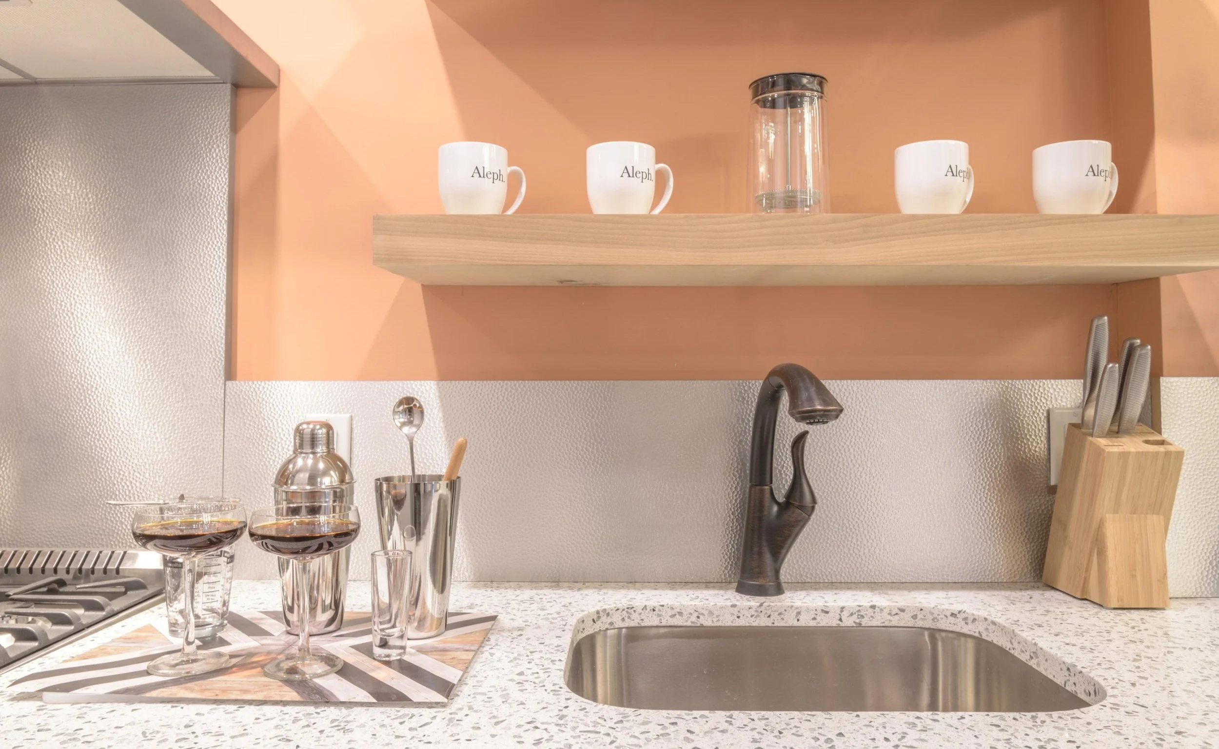 Finishes: Linen, brass, rattan, white ceramic subway, and quartz
